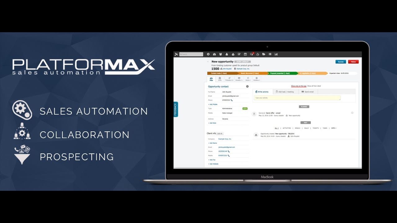 4.7/5 (66 reviews)Platformax let's you organize an effective sales process, by letting you manage your leads and customers in one place, track your sales pipeline and manage your sales reps' tasks and prospect faster than ever, with automated email campaigns and calls straight from the CRM.